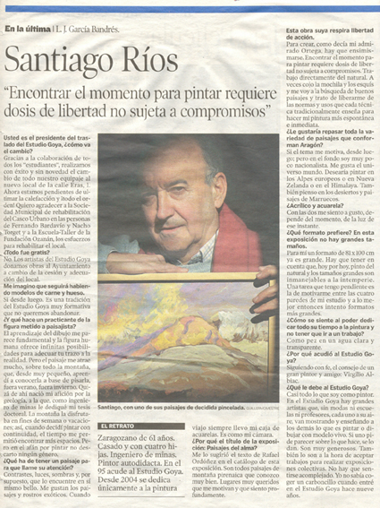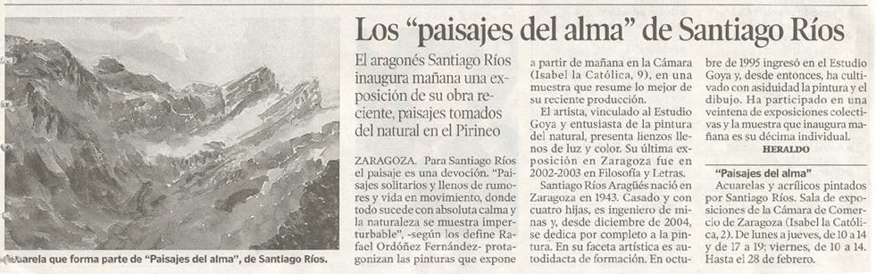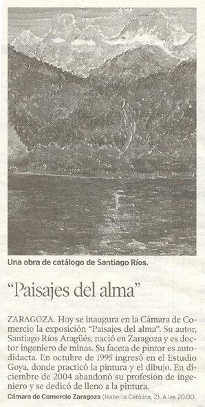 In this exhibition I presented 24 paintings depicting some of the mountains in the Pyrenees, half of which were acrylic while the remaining half were watercolours. A catalogue was published containing 13 colour reproductions together with a text by Rafael Ordoñez: “Landscapes of the Soul in the Painting of Santiago Ríos”, which I have inserted below the paintings appearing on this page in spanish. The Heraldo de Aragón published several reviews of this exhibition, besides an interview of the artist on the back cover, which was written by Luis García Bandrés and came out on the day of its inauguration (also below).