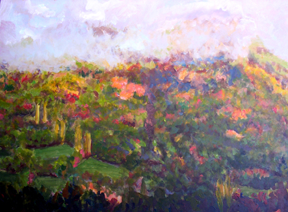 Ese color primero y casi virginal que surge de las mismas entrañas de la tierra y fiel a sus orígenes va dotando de vida y atributos a cuanto en ella existe, de modo que los ocres, las tierras y los verdes pululan por el campo fértil y ensimismado, y en las montañas viven los grises y amarillos, pero también los verdes, los sienas, los azules y una gama infinita de blancos y violetas recordando el aroma de las viejas canciones que alentaron los fuegos de tanta travesía, y los rojos señalan la presencia de frutos y disputan al cadmio las hojas del otoño, verdiazulado a veces en álamos enhiestos y frondosos arbustos de olor inolvidable, y grisáceo y fluido como suelen las aguas que corren presurosas o meditan despacio en revueltas y pozas donde toda la infancia se baña sin descanso antes de que los humos de hogueras invernizas se diluyan despacio entre los esqueletos vegetales o asciendan hacia un cielo impregnado de azules rotundos e imposibles, salvo en el sentimiento volátil de los sueños, y transidos a veces de nubes multiformes que Santiago dispone blancuzcas y ligeras como un amable intruso en el fulgor del alma.