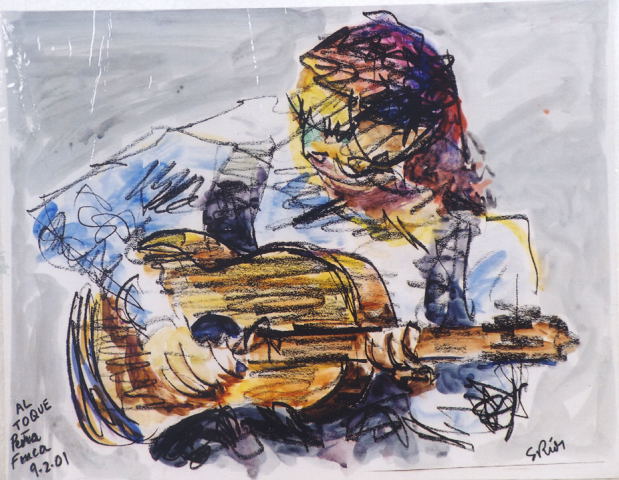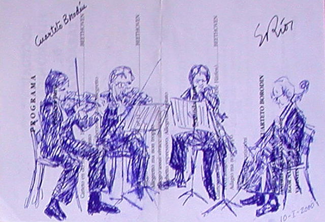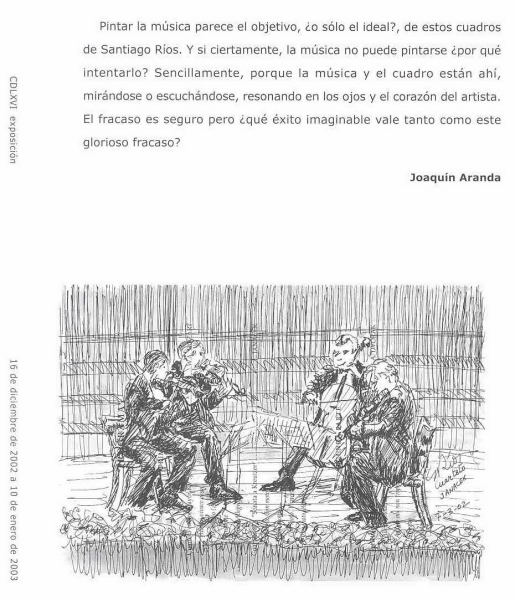 In this exhibition I showed a series of ink drawings on musical programmes done during musical concerts, as well as water paintings created from those drawings after their digital treatment and printing. In the catalog and invitation card published by the Faculty of Arts was included a text by the reputed musical critic Joaquín Aranda, together with the drawing reproduced below: