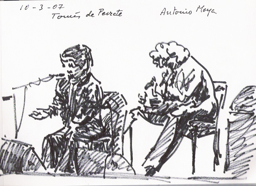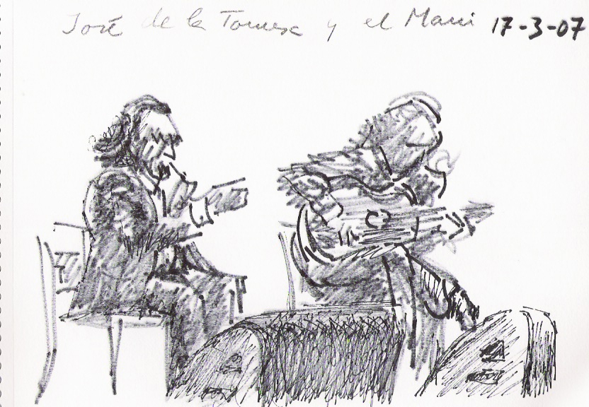 de Perrate singing and Antonio Moya with guitar, ink, 15 x 21 cm,