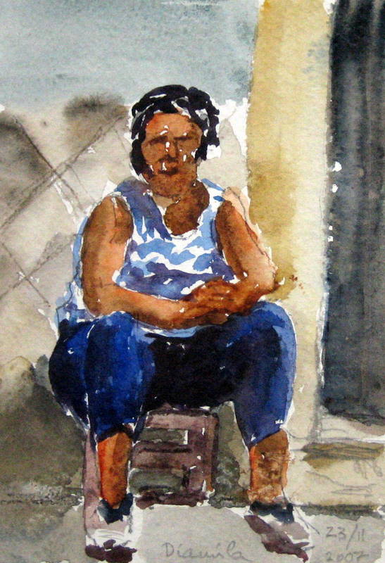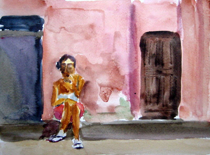 Diamila at her doorstep, watercolor, 12 x 18 cm