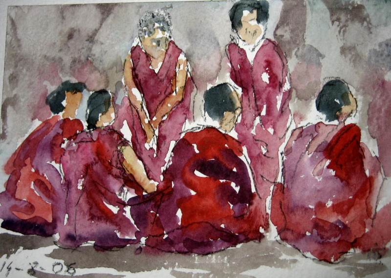 Monks discussing theology in Sera Monastery (watercolor, 12 X 18 cm)