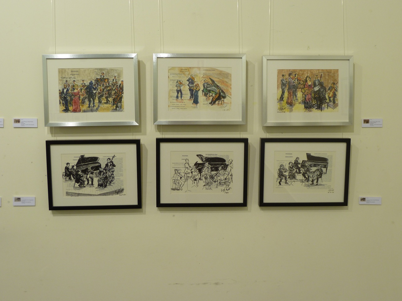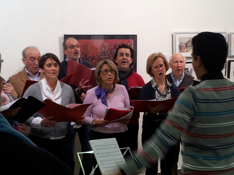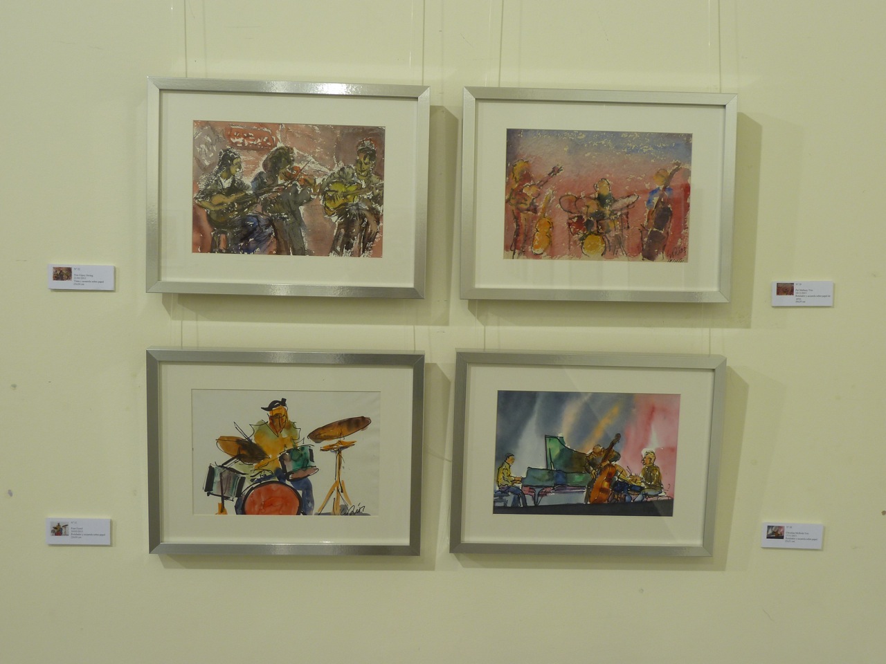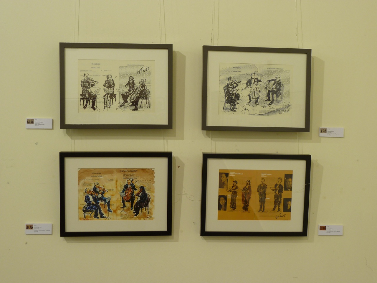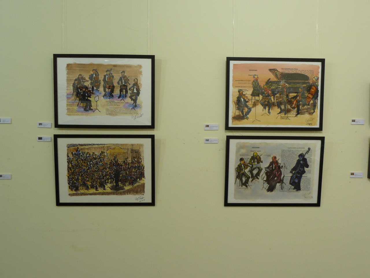 En esta exposición presenté 57 cuadros relacionados con la música clásica, jazz, flamenco o con la música étnica africana. La mayoría de ellos están hechos en directo, en algunos casos, sobre el programa del concierto. Algunos de los cuadros de mayor formato fueron hechos en mi Estudio con diferentes técnicas: acuarela, acrílico u óleo. Edité un CATÁLOGO con la reproducción de alguno de los cuadro expuestos y con texto de Antón Castro. El Heraldo de Aragón se hizo eco de la efemérides publicando un artículo del mismo periodista el día de la inauguración. Mi agradecimiento al coro de cámara Modus Novus, al que pertenezco, que actuó en la inauguración de la Exposición con un par de canciones.
