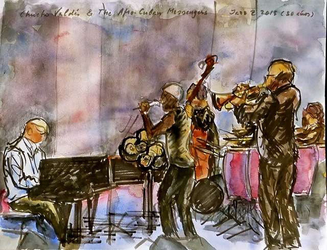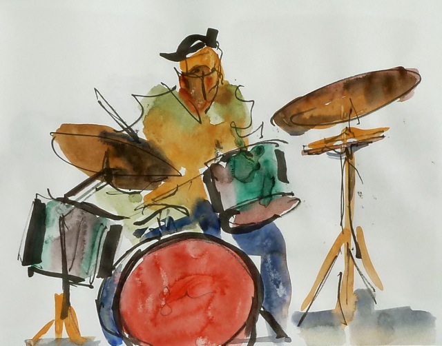 Francia y luego por España. Y también le gusta mucho el flamenco: sus rituales, el duende, los sonidos negros, la energía tumultuosa de las voces, desde Mairena, El Cabrero, Camarón o Morente hasta los penúltimos intérpretes Carmen Linares, Miguel Poveda o Mayte Martín, por poner algunos nombres. Esta exposición es un nuevo homenaje a la música. Algo que ya había hecho, al menos, en 2006. Algo que hace casi a diario, desde el Auditorio o en cualquier otro escenario. En esta muestra, llena de sensibilidad y de aventura plástica, están esos dibujos (a plumilla, a carbón o a rotulador) que lo dicen casi todo: atrapan la música al vuelo. Atrapan la puesta en escena, el orden de la orquesta, el ruido y la furia de una sinfonía. Atrapan un ambiente de ritual. Aquí hay colectivos orquestales o la silueta de una dama del violín como la joven Alma Olite, pongamos por caso. Y están también los ecos del jazz: los grupos, los violencellos, el rugido de los vientos, el trallazo de los pianos, las voces oscuras que iluminan el mundo de desgarro e intensidad. Pero no solo eso: también están los cantaores, el acorde de las guitarras, que nadie puede callar. El conjunto de la obra prueba muchas cosas: la ilusión gigantesca de Santiago Ríos. El corazón musical de sus trazos. La pulsión, la soltura, la libertad creativa, el placer de pintar. La intuición de agarrar en pleno vuelo los sones inefables, la abstracción de las notas. Y prueba su versatilidad: a veces parece citarse con Antonio Saura y sus tonos estilizados del negro como aves esparcidas de tinta, o con Paul Klee, con el dibujante libérrimo Federico García Lorca, tan dado a la fantasía y al gesto onírico. O con George Roualt, especialmente en esas acuarelas llenas de color y temblor: color trabajado y depurado, color expandido y suelto como una rosa intemporal. Santiago Ríos tiene un don. Y perspicacia. Y paciencia. Cuando sale del concierto ya casi ha hecho su faena. Ha devuelto en un trazo de pura síntesis visual la mejor imagen de la bella Eliane Elías o esa forma de arañar la guitarra de Pat Metheny. Luego, en su estudio (o en el Estudio Goya que frecuenta desde hace dos décadas), culmina su cuadro o su lámina: le confiere matices, la redondea, la ciñe a su quimera y la culmina como pretende hacerlo: la pintura es un ideal, una cifra del pentagrama, la energía de un carisma y de un modo de interpretación. La abstracción y la figuración se entreveran en Santiago Ríos como se entreveran el corazón de madera del violín y el corazón de metal del piano. |