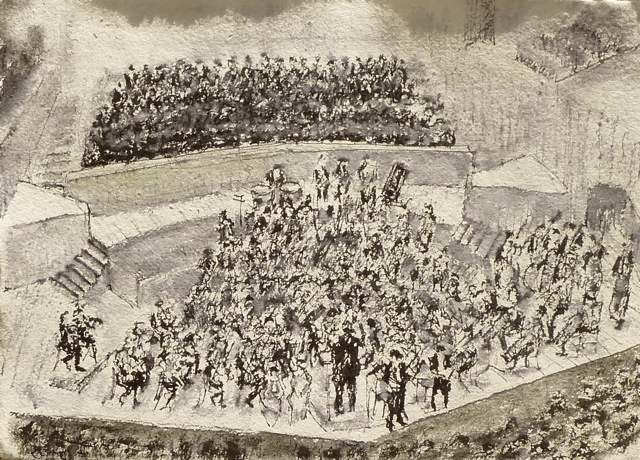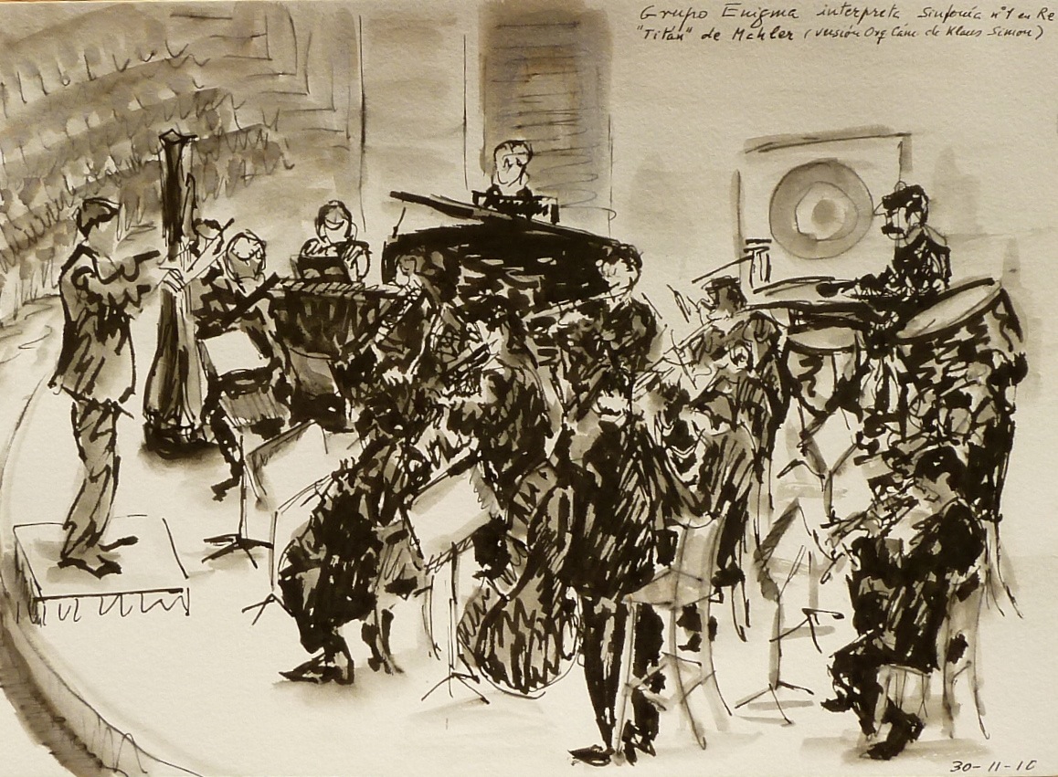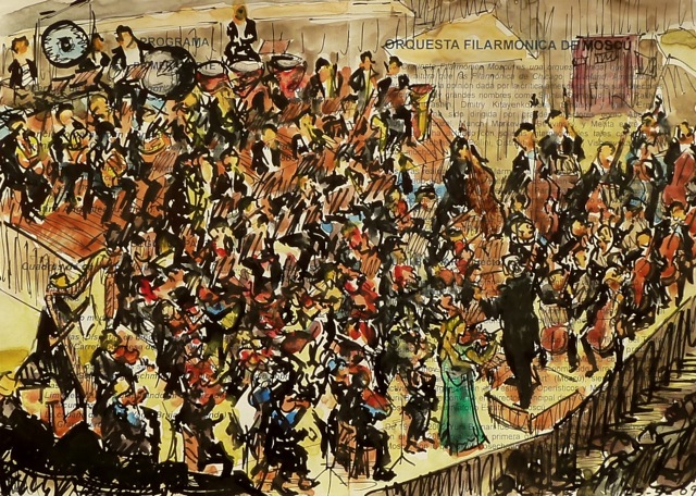 Antón CASTRO Santiago Ríos (Zaragoza, 1943) es un pintor de la naturaleza y de la música. En realidad, quizá sea algo semejante: la naturaleza tiene música y la música tiene paisaje, melodía, ritmo, el latido del viento y el laberinto del silencio. Santiago se acomoda muy bien a cualquier formato o técnica. Si se repasa su trayectoria, se percibe de inmediato que se siente cómodo con el óleo, con el acrílico, con la acuarela o con los lápices, la tinta y rotuladores. Dicho esto, conviene insistir en algo muy particular: la música le encanta. Desde hace muchos años. Desde siempre tal vez. No sé si tiene algo que ver su profesión de ingeniero de minas. O más bien con su segundo oficio, y su pasión desde hace mucho tiempo: la pintura. El taller. Los pintores son buenos oyentes de la radio, de las noticias y, sobre todo, de las canciones. Además, Santiago Ríos asiste con toda la frecuencia que puede a los conciertos: conciertos de música clásica, a los de orquestas, a los de grupos de cámara o a los dos solistas, y posee un buen conocimiento de los elencos y de los compositores clásicos y modernos. Asiste a los conciertos y lo hace de una manera especial: con sus lápices, con sus acuarelas, con la emoción encendida, con la percepción abierta a cualquier sugerencia, ademán o movimiento. No es un melómano inocente: al contrario, es un oyente estremecido, o que se estremece casi de inmediato, atento, entusiasta. Apasionado. Y así, de esa atención y de esa emoción, nacen muchos de sus cuadros. Suele utilizar los programas (del Auditorio, de la Sociedad Filarmónica, que son sus favoritos tal vez por la profusión de blancos, de otras salas) y a medida que discurre el concierto, a medida que los instrumentos dialogan entre sí, él atrapa el espíritu de la música y los modos de los instrumentistas o de los vocalistas. Y también, cómo no, la agitación de manos y de ánimo del director de orquesta. A un hombre como él, tan viajado y tan curioso, le interesan muchas más cosas: el jazz, sin duda, esa música que va de África a América (todas las Américas: la del norte, la caribeña, la andina...) y que llega con inusitada fuerza a Europa en la segunda década del siglo XX, por