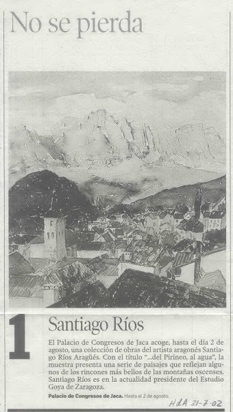 En el verano del 2002, en el Palacio de Congresos de Jaca, expuse 45 cuadros pintados al acrílico o a la acuarela. La exposición la titulé "... del Pirineo, al agua". Tuve una reseña en el Heraldo de Aragón del día 31 de julio de 2002.