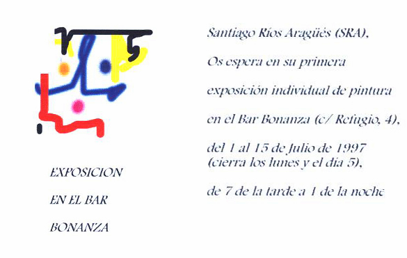 En mi primera exposición, en el bar Bonanza de Zaragoza, en julio de 1997, presenté una serie de paisajes, algunos de los cuales se pueden ver más abajo. También presento la invitación que confeccioné con tal motivo: