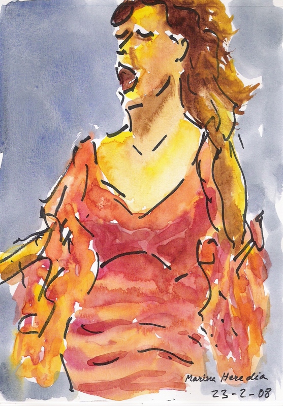 Marina Heredia al cante (Flamenco Zaragoza 2008), tinta y acuarela, 21 x 15 cm