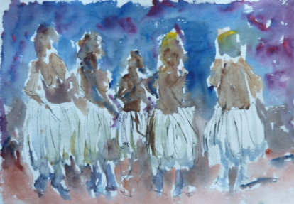 Danza de pigmeos, tinta y acuarela, 35x 50 cm