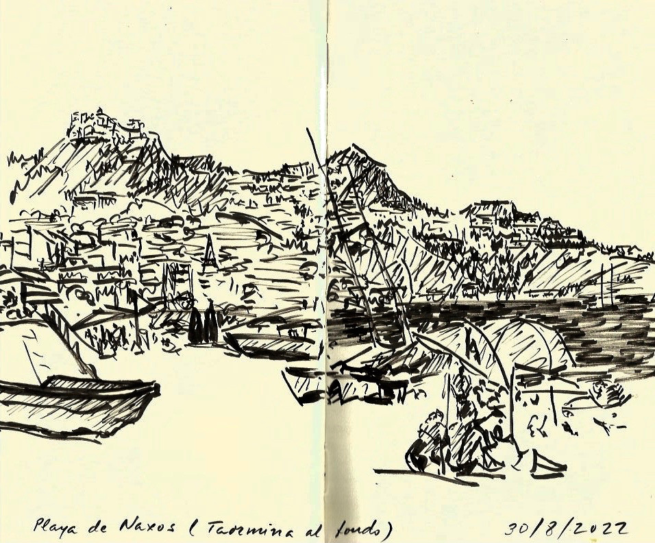 Playa de Naxos, al fondo Taormina (rotulador sobre cuaderno Sakura 21x13 cm)